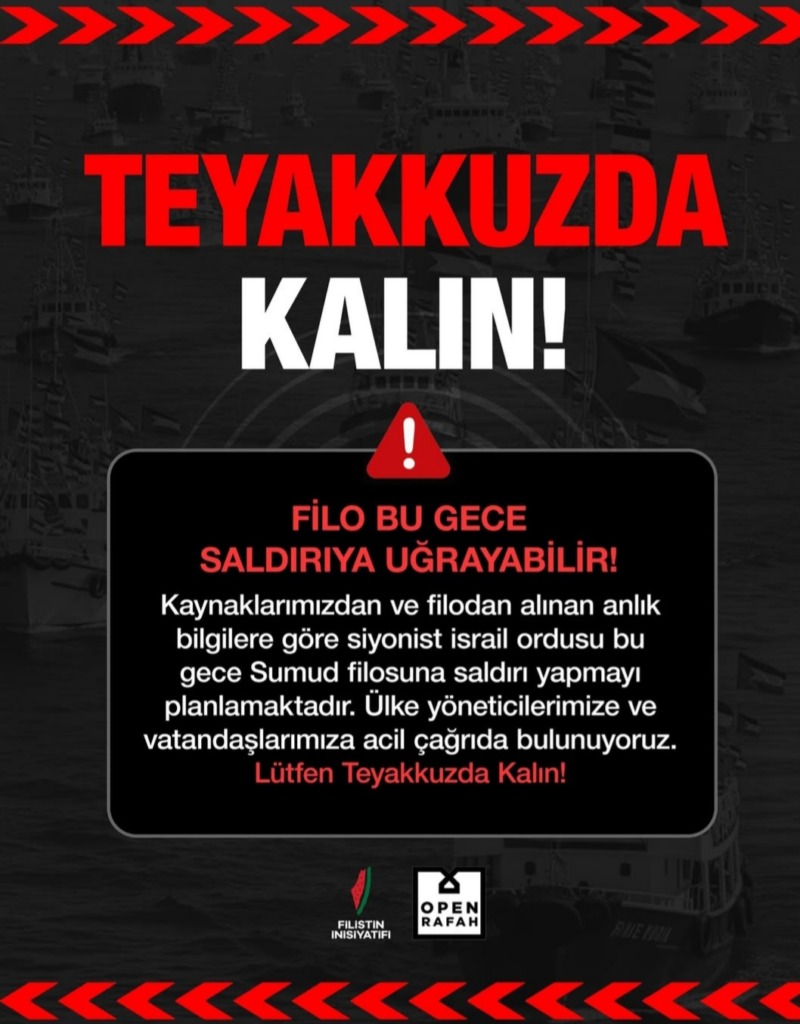 Sumud kaynaklarından edinilen bilgilere göre, siyonist İsrail ordusunun bu gece filoya saldırı düzenlemeyi planladığı ileri sürüldü. Filo içerisinden gelen anlık bilgilerle desteklenen iddialar üzerine, ülke yöneticilerine ve vatandaşlara “teyakkuzda kalın” çağrısı yapıldı.